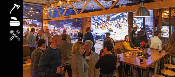 Ein komplettes Firmenevent mit 1 Stunde Axtwerfen, 1 Stunde Curling im Alpenstil und einer mexikanischen Salsa-Barbecue. Ein stimmungsvolles Indoor-Erlebnis für Unternehmen.