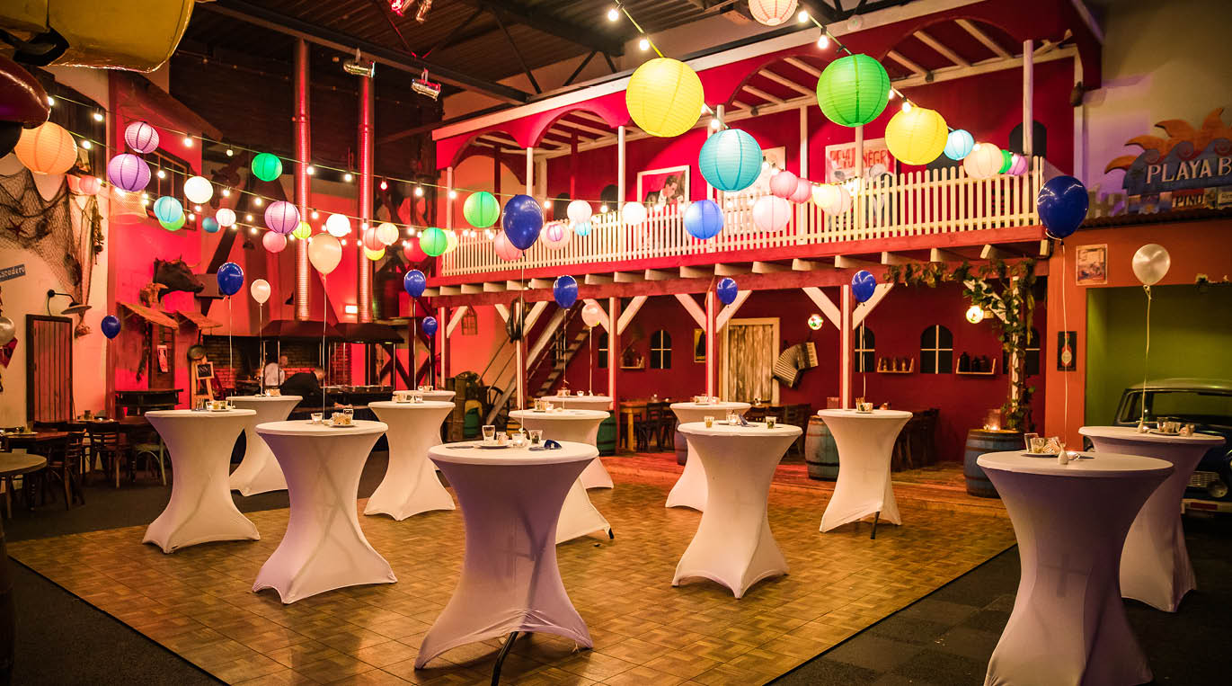 In onze Salsa zaal bevind je je op een vrolijk marktplein compleet met een Zuid-Amerikaans thema! Het plein is helemaal aangekleed in een Cubaanse, warme stijl. De Salsa zaal voelt open aan en is ruimtelijk ingericht, zodat het voelt alsof je in de buitenlucht staat. Daarnaast beschikt de zaal over een grote barbecue en buffettafel, waardoor hier ook heerlijk gegeten kan worden. Ritmische salsa muziek, de geur van barbecue en vrolijke feesten te midden van een Zuid-Amerikaans decor brengt je in een unieke sfeer die ongekend is! In onze salsa zaal is plaats voor ongeveer 250 personen staand of 150 personen zittend.